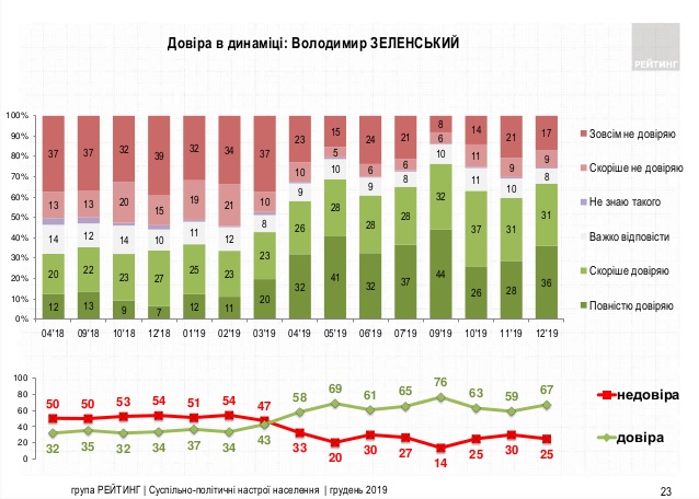 Президенту Украины Владимиру Зеленскому доверяют 67% опрошенных украинцев. Только 25% респондентов высказались о недоверии к лидеру страны.