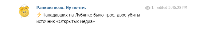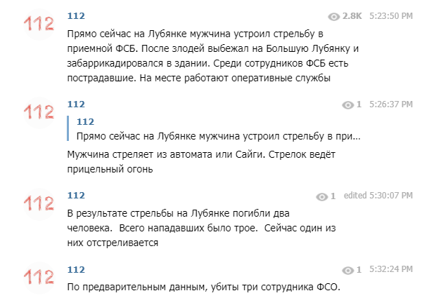 "Прямо сейчас на Лубянке мужчина устроил стрельбу в приемной ФСБ. После злодей выбежал на Большую Лубянку и забаррикадировался в здании. Среди сотрудников ФСБ есть пострадавшие. На месте работают оперативные службы", - говорится в сообщении