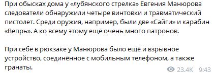 Согласно имеющейся информации, при себе на Лубянке у Манюрова было взрывное устройстве, соединенное с мобильным телефоном и гранаты.