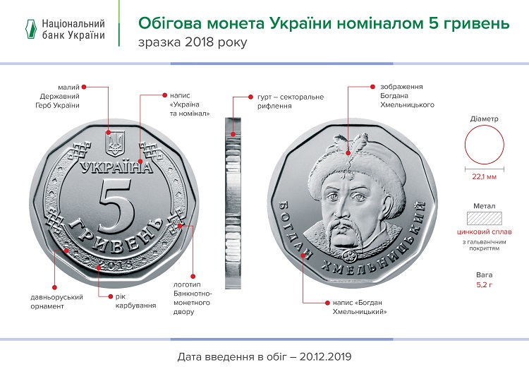На монетах, как и на банкнотах, изображен Богдан Хмельницкий. Монета номиналом 5 гривен почти на 2 мм больше в диаметре по сравнению с 2-гривневой. Ее вес - 5,2 грамма.