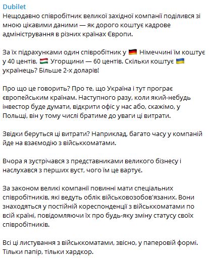 "Военкоматы, трудовые книжки, больничные и много других аспектов - все это должно быть максимально упрощено. Стремимся, чтобы стоимость сопровождения сотрудника была, как в Германии", - резюмировал Дубилет.