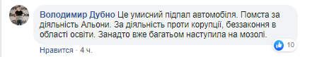 "Это умышленный поджог автомобиля. Месть за деятельность Алены. За деятельность против коррупции, беззакония в области образования. Слишком уж многим наступила на мозоли", - пишет Владимир Дубно.