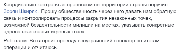 "Со вчера (9 декабря 2014 года - Ред.) стартовал процесс в Киеве, Киевской и Днепропетровской области. Так, например, вчера, в Днепропетровске, в рамках возбужденного уголовного дела (ст.203-2 ККУ), проведено 23 обыска и по результатам обезврежена сеть из 21 игорного заведения и двух офисов. В ходе операции у организаторов незаконных игровых заведений изъято 223 игровых автомата, 3 рулетки, 84 единицы спец компьютеров, 120 тыс.грн, 5.7 тыс $. Реализованы персональные судебные санкции к организаторам", - говорилось тогда на фб-странице министра внутренних дел.