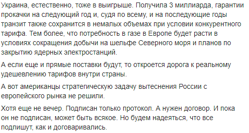 "Украинская сторона празднует перемогу. Европа довольна. Россия комментирует скупо. Что и не удивительно. Выглядит так, что она пошла на очень большие уступки. Хотела контракт на год, заключила на 5 лет. Хотела, чтоб Украина отказалась от своих требований по Стокгольму, а теперь согласилась заплатить Киеву 3 млрд деньгами. В обмен на отзыв еще не выигранных исков.