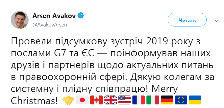 В конце записи Аваков поблагодарил послов за системное и плодотворное сотрудничество, назвав их коллегами. А также по-английски пожелал счастливого Рождества.
