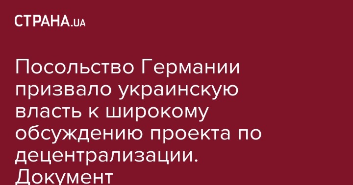 Посольство Германии в Украине хочет обсудить проект децентрализации президента Владимира Зеленского и усиления местного самоуправления в стране. Об этом говорится в документе посольства ФРГ, которое оказалось в распоряжении "Страны".