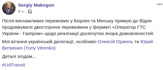 "После изнурительных переговоров в Берлине и Минске направляюсь в Вену продолжать двусторонние переговоры в формате "Оператор ГТС Украины - Газпром" по реализации достигнутых вчера договоренностей", - написал он в Facebook.