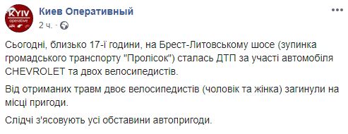 Сегодня, 21 декабря, в районе 17:00 на Брест-Литовском шоссе в Киеве автомобиль марки Chevrolet сбил двух велосипедистов - оба погибли. Об этом сообщается на странице "Киев Оперативный" в Facebook со ссылкой dtp.kiev.ua.