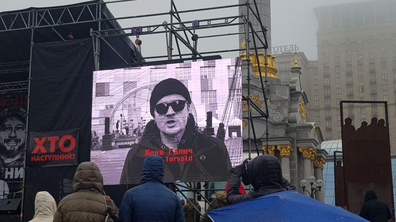 По состоянию на 12:30, присутствуют около 100 человек. Идет дождь, поэтому слушатели то подходят, то расходятся. На экранах транслируют видео с разными исполнителями, которые говорят, что не верят в причастность Андрея Антоненко и Юлии Кузьменко к убийству Павла Шеремета. Никаких политических флагов, никаких активистов и полиции пока нет.
