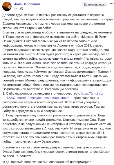 Настоятель Ионинского монастыря в Киеве Иона Черепанов написал на своей странице в Facebook пост с опровержением "пророчества" относительно скорой третьей мировой войны.