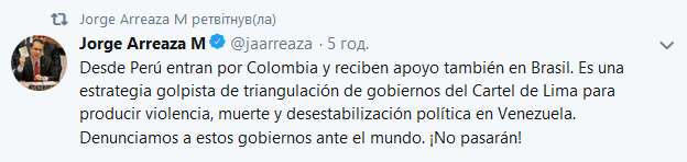 Глава МИД Венесуэлы Хорхе Арреаса прямо обвинил Перу в причастности к нападению. Об этом он написал в своем Twitter.