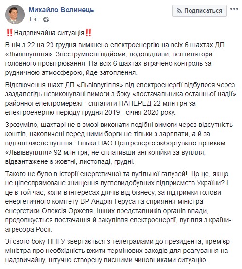 "В ночь с 22 на 23 декабря отключена электроэнергия на всех шести шахтах ГП "Львовуголь". Обесточены подъемы, водоотливы, вентиляторы главного проветривания. На всех шести шахтах утрачен контроль за рудничной атмосферой, идет затопление", - написал Волынец.