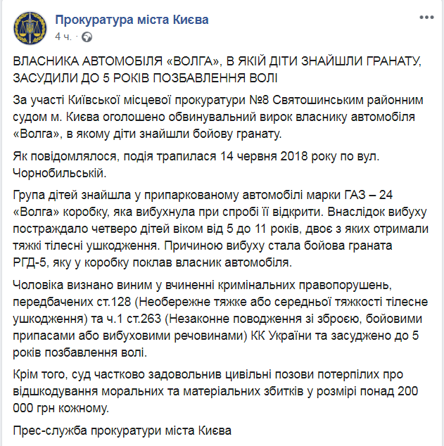 Сергея Михасюка, владельца автомобиля "Волга", в котором в июне 2018 года сдетонировала граната, ранив детей, приговорили к 5 годам лишения свободы. Об этом в Facebook сообщает пресс-служба прокуратуры Киева.