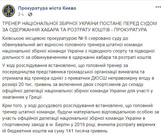 Тренера национальной сборной по подводному спорту и подводной деятельности, которую задержали в июне этого года, будут судить за получение взятки и растрату средств. Об этом сообщает прокуратура Киева в Facebook.