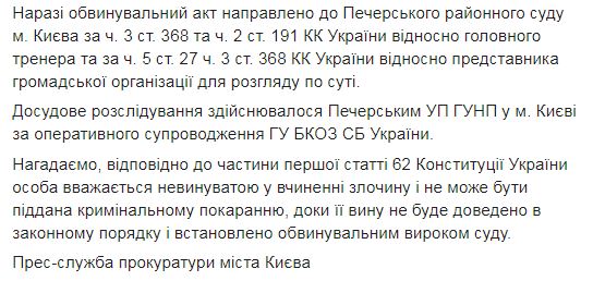 В ходе расследования было установлено, что главный тренер при посредничестве представителя общественной организации требовала и получила от тренера одной из частных спортивных школ неправомерную выгоду в размере 20 000 гривен за включение двух спортсменов в состав официальной делегации нацсборной для участия в соревнованиях в Греции.