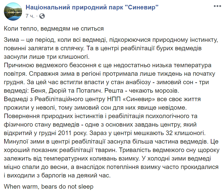 Медведи в центре реабилитации бурых медведей "Синевир" в Карпатах не могут уснуть из-за теплой погоды. Об этом сообщается на фб-странице пресс-службы Национального природного парка Синевир во вторник, 24 декабря.