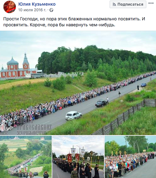 В 2016 году Юлия Кузьменко публиковала пост с критикой крестного хода прихожан Украинской православной церкви, который был приурочен ко Дню Крещения Руси.