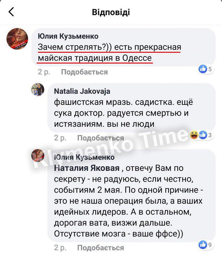 В Сети опубликовали комментарий Кузьменко в Facebook, где она поддерживает сожжение людей в Одессе 2 мая 2014 года. Убийство антимайдановцев она называет "прекрасной майской традицией".