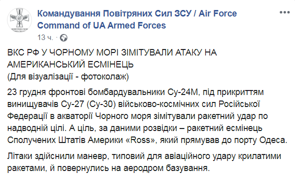 Фронтовые бомбардировщики Су-24М под прикрытием истребителей Су-27 (Су-30) военно-космических сил Российской Федерации в акватории Черного моря 23 декабря сымитировали ракетный удар по надводной цели. Об этом сообщает в Facebook командование воздушных сил ВСУ.