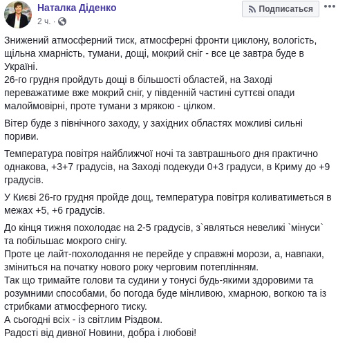 "В Киеве 26-го декабря пройдет дождь, температура воздуха будет колебаться в пределах +5...+6 градусов" - написала Диденко.