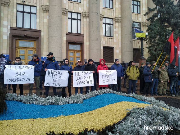 В Харькове возле здания облгосадминистрации около двухсот активистов "Национального корпуса", "Правого сектора", "Фрайкора" и общественной организации "Традиции и порядок" протестуют против возможного обмена обвиняемых в теракте возле Дворца спорта в 2015 году. Об этом сообщает Hromadske.