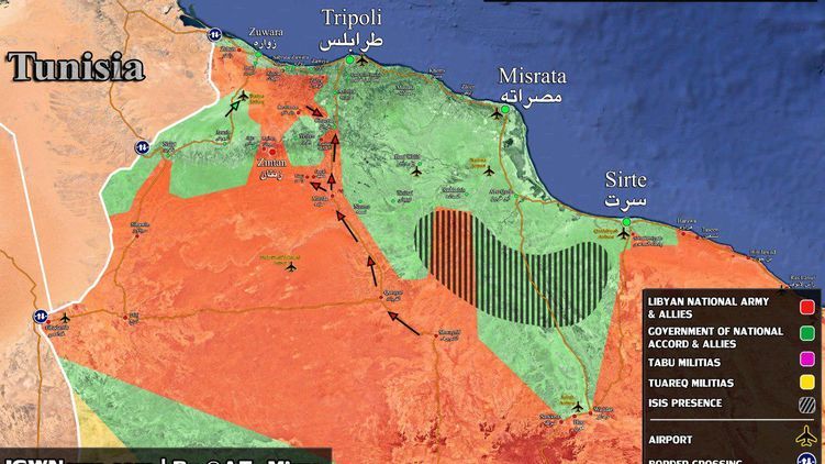 Примерное положение дел в Ливии перед началом наступления Хафтара на Триполи. красным - Халифа Хафтар, зеленым - ПНС, фото: t.me/AssadStash