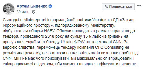 "Обыски проходят в рамках дела о тендере, проведенном в 2018 на сумму 15 миллионов гривен на продвижение Украины и бренда UkraineNOW на телеканале CNN. По версии следствия, победитель тендера компания CFC Consulting не разместила рекламу, несмотря на наличие актов выполненных работ от CNN. МИП нечего скрывать, мы максимально сотрудничали и сотрудничаем со следствием, чтобы как можно быстрее зафиксировать выводы", - написал в соцсети Биденко.