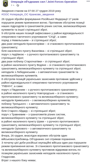 "26 декабря вооруженные формирования Российской Федерации 17 раз нарушили режим прекращения огня. Противник обстрелял позиции наших подразделений из гранатометов различных систем, крупнокалиберных пулеметов и другого стрелкового оружия… в результате вражеских обстрелов один военнослужащий Объединенных сил получил ранения", - говорится в утренней сводке на странице штаба в Фейсбук в пятницу.