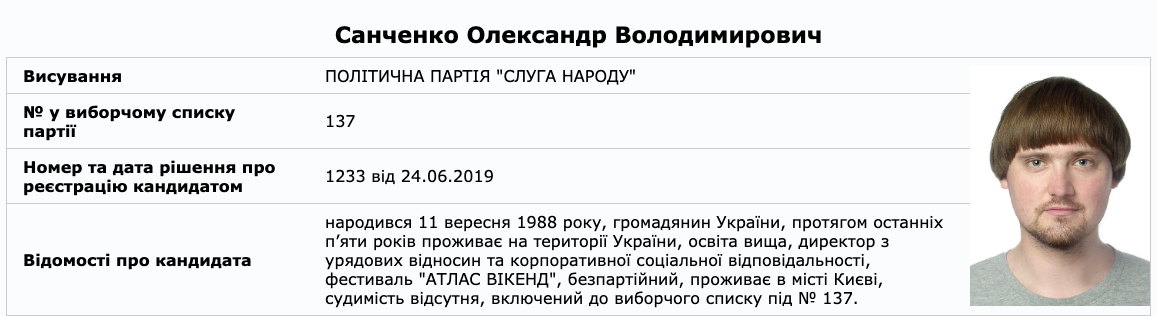 Санченко, находящийся под номером 137 в списке партии "Слуга народа", родился в 1988 году и имеет высшее образование. Также, как указано в списке политсилы, он является директором по правительственным отношениями и корпоративной социальной ответственности. Кроме того, Санченко является одним из организаторов фестиваля "Атлас Викенд". Сообщается, что он беспартийный и не имеет судимостей.
