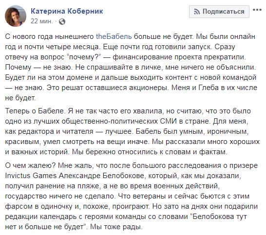 Интернет-издание theБабель с 1 января 2020 года прекращает свое работу. Об этом сообщила шеф-редактор сайта Катерина Коберник в Facebook.