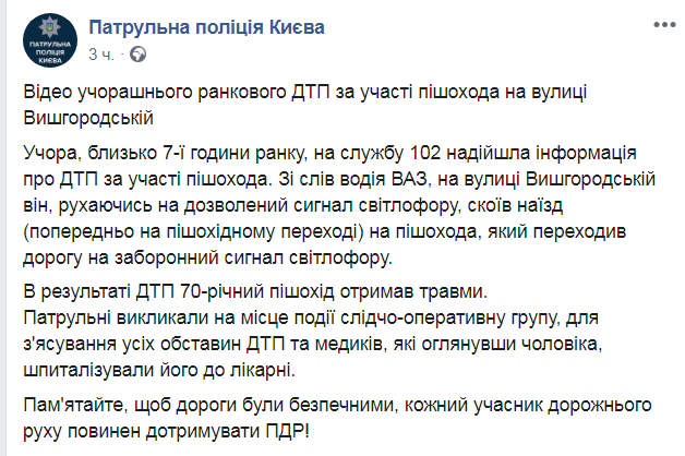 Патрульная полиция Киева опубликовала видео ДТП, которое произошло 26 декабря с участием пешехода на улице Вышгородской. Ролик опубликован в YouTube полиции.