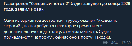 Россия запустит газопровод "Северный поток-2" до конца 2020 года. Об этом заявил министр энергетики Российской Федерации Александр Новак, передает РИА Новости в Телеграме.