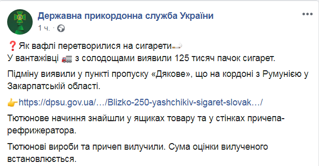 Согласно документам, 53-летний гражданин Словакии перевозил из Львова в Бухарест грузовиком марки Renault ящики со сладостями. Как выяснилось при осмотре, вместо вафель в ящиках были табачные изделия.