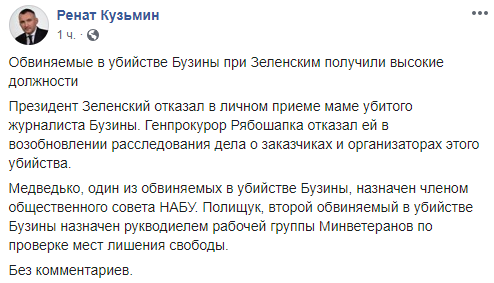 "Президент Зеленский отказал в личном приеме маме убитого журналиста Бузины. Генпрокурор Рябошапка отказал ей в возобновлении расследования дела о заказчиках и организаторах этого убийства. Медведько, один из обвиняемых в убийстве Бузины, назначен членом общественного совета НАБУ. Полищук, второй обвиняемый в убийстве Бузины назначен руководителем рабочей группы Минветеранов по проверке мест лишения свободы" - написал Кузьмин.