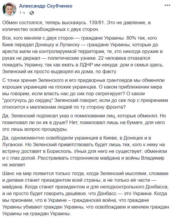 С точки зрения Зеленского и его придворных грантоедов мы обменяли хороших украинцев на плохих украинцев. О каком приближении мира мы говорим, если власть нас до сих пор сегрегирует? О каком "достучусь до сердец" Зеленский говорит, если до сих пор с презрением относится к миллионам людей по ту сторону фронта?
