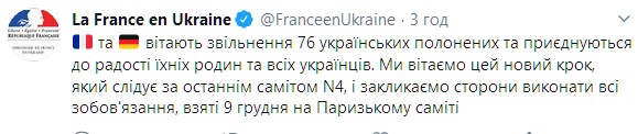 "Франция и Германия приветствуют освобождение 76 украинских пленных и присоединяются к радости их семей и всех украинцев. Мы приветствуем этот новый шаг, который следует за последним саммитом нормандской четверки, и призываем стороны выполнить все обязательства, взятые 9 декабря на Парижском саммите", - говорится в сообщении.