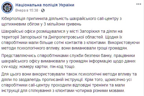 "Киберполиция прекратила деятельность мошеннического call-центра с еженедельным оборотом в 3 миллиона гривен. Мошеннические офисы размещались в городе Запорожье и действовали на территории Запорожской и Днепропетровской областей. Ежедневно их сотрудники имели более сотни контактов с клиентами. Используя методы психологического воздействия, они выманивали деньги граждан", - говорится в сообщении.