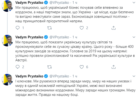 "Наше правительство работает для того, чтобы люди чувствовали результаты уже сейчас, а не через 3-4 года. Сегодня - немного предновогодних итогов Министерства иностранных дел. Впоследствии - о планах", - написал Пристайко.