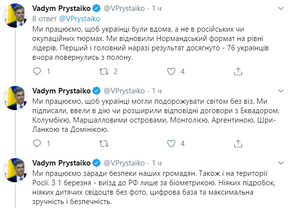 Министр иностранных дел Украины Вадим Пристайко подвел итоги года, рассказав про освобождение пленных с ОРДЛО, расширение перечня стран, куда украинцы могут ездить без виз, изменение правил поездок в Россию - по загранпаспортом, расширение штата украинских консулов за границей, работу в международных организациях над доказательствами, что РФ нарушает права человека, а также движение Украины вперед ради мира. Об этом он написал в Twitter.
