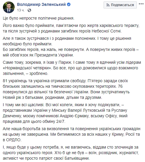 Именно поэтому, в частности, я ехал в Париж. И именно поэтому я благодарен всем лидерам "Нормандской четверки". Потому что все, о чем договорились о взаимном освобождении, - сделано.