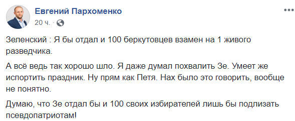 "То есть, 100 граждан Украины отдал бы в "плен" "террористам", чтобы освободить из "плена" одного гражданина Украины? Вы понимаете, что такое заявление — это дно? Кроме патриотов майдана других граждан Украины для Зеленского не существует. Поздравляю, новая команда нас уже поделила на сорты".