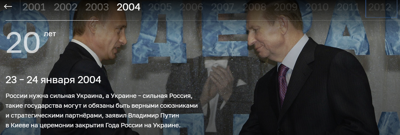 Фото за 23 и 24 января 2004 года, на которых Путин пожимает руку Кучме, подписаны так: "России нужна сильная Украина, а Украине – сильная Россия, такие государства могут и обязаны быть верными союзниками и стратегическими партнерами, заявил Владимир Путин в Киеве на церемонии закрытия Года России на Украине".