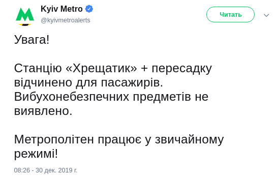 "Внимание! Станцию "Крещатик" + пересадку открыто для пассажиров. Взрывоопасных предметов не обнаружено. Метрополитен работает в обычном режиме!", - сказано в сообщении.