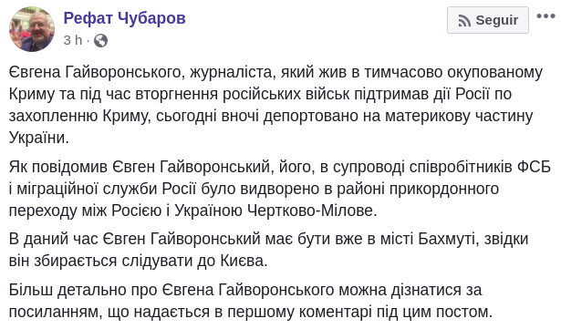 "Как сообщил Евгений Гайворонский, его в сопровождении сотрудников ФСБ и миграционной службы России были выдворены в районе пограничного перехода между Россией и Украиной Чертково-Меловое", - отметил Чубаров.