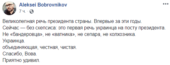 "Великолепная речь президента страны. Впервые за эти годы. Сейчас — без скепсиса: это первая речь украинца на посту президента. Не "бандеровца", не "ватника", не сепара, не колхозника. Украинца. Объединяющая, честная, чистая. Спасибо, Вова. Приятно удивил", - пишет журналист Алексей Бобровников.