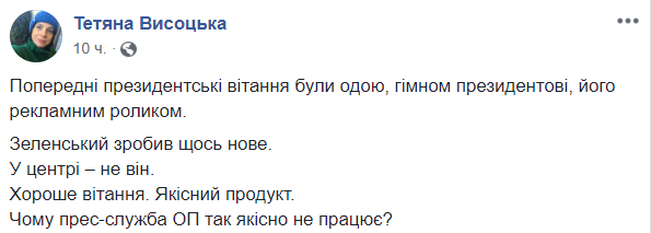Хорошее приветствие. Качественный продукт. Почему пресс-служба ОП так качественно не работает?", - задается вопросом журналистка Татьяна Высоцкая.