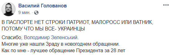 "Спасибо, Володимир Зеленський. Многие уже нашли Зраду в новогоднем обращении. Как по мне - лучшее обращение Президента за 28 лет", - пишет телепродюсер "NewsOne" Василий Голованов.