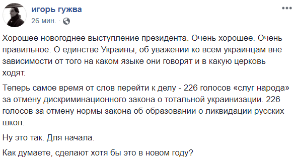 "Хорошее новогоднее выступление президента. Очень хорошее. Очень правильное. О единстве Украины, об уважении ко всем украинцам вне зависимости от того на каком языке они говорят и в какую церковь ходят.