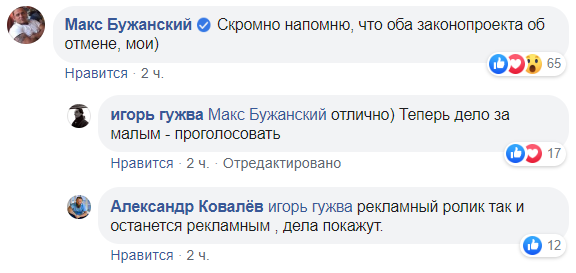 "Рекламный ролик так и останется рекламным, дела покажут", - написал в комментариях у Гужвы нардеп Александр Ковалев.