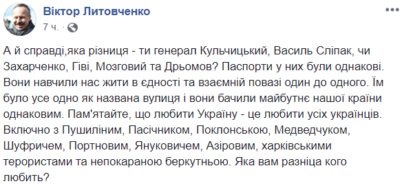 "А действительно, какая разница - ты генерал Кульчицкий, Василий Слипак, или Захарченко, Гиви, Мозговой и Дремов? Паспорта у них были одинаковые. Они научили нас жить в единстве и взаимном уважении друг к другу. Им было все равно как названа улица и они видели будущее нашей страны одинаковым. Помните, что любить Украину - это любить всех украинцев.